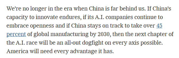 文章称,当下已不再是中国远落后于美国的时代了。如果中国的创新能力持续,如果中国的人工智能企业继续选择开放策略,如果中国能持续朝2030年占全球制造业超过45%的目标努力,那么未来人工智能竞赛将会成为各领域的全面竞争。美国将需要利用其所拥有的每一分优势。