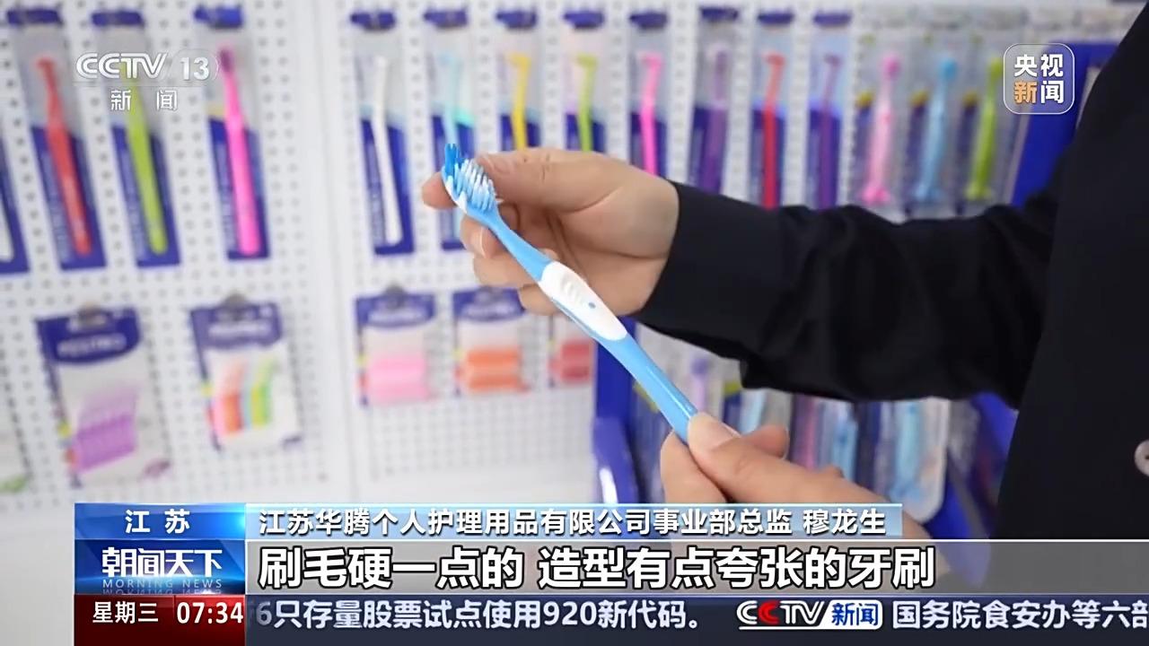 江苏华腾个人护理用品有限公司事业部总监 穆龙生:美国市场比较喜欢一些头大一点的、刷毛硬一点的、造型有点夸张的一些牙刷。我们国内的用户比较喜欢一些小巧的精致一点,然后颜色搭配也比较小清新这样一些产品,所以两个市场完全就不一样。
