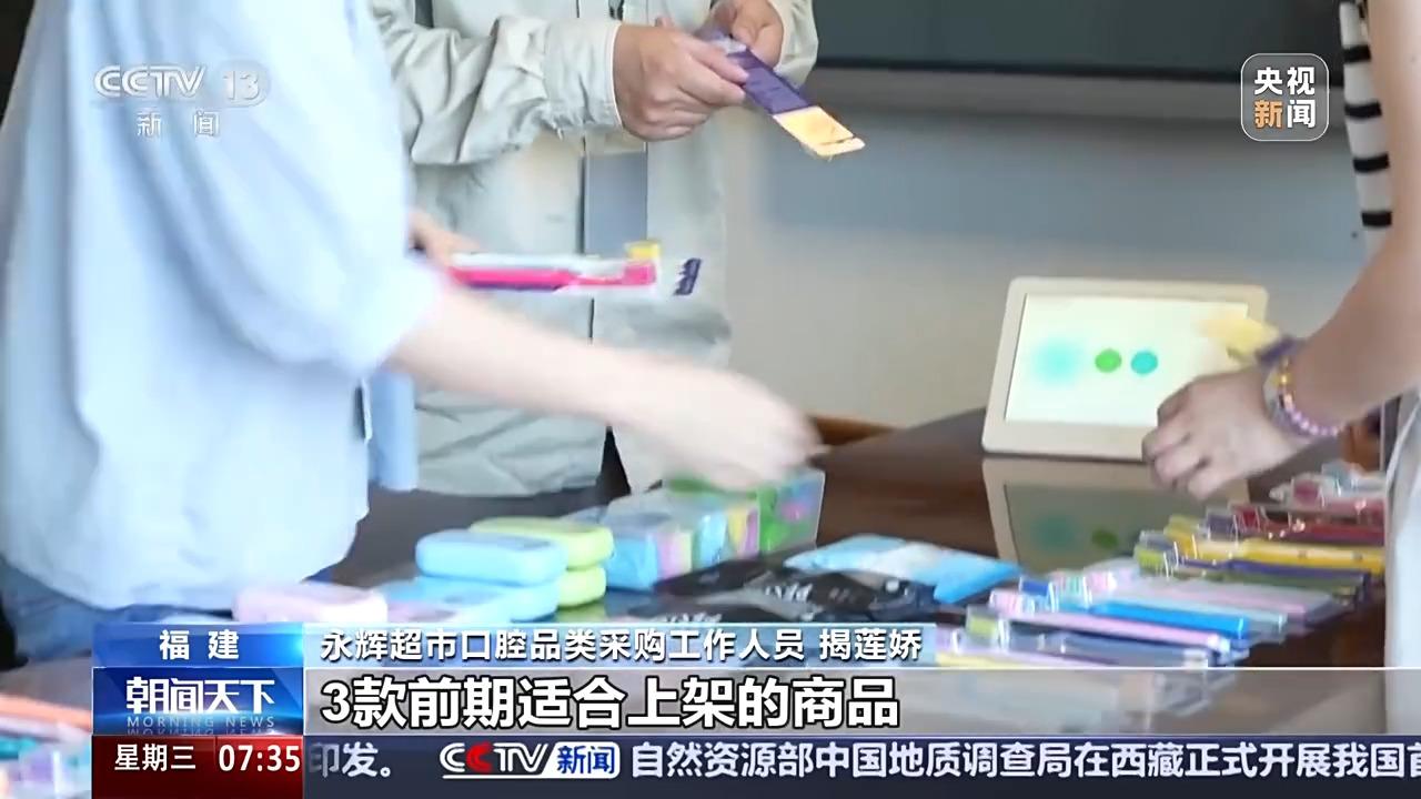 永辉超市口腔品类采购工作人员 揭莲娇:我们是4月13日收到的样品,当时我们内部拉通了各部门人员一起参与样品的查验,同时,我们也研判市场的消费喜好,在第二天就选出了3款前期适合上架的商品。