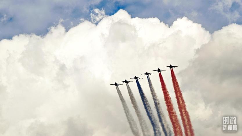 △5月7日,参加纪念苏联伟大卫国战争胜利80周年庆典彩排的空中飞行梯队飞越红场。(总台央视记者王哈男拍摄)