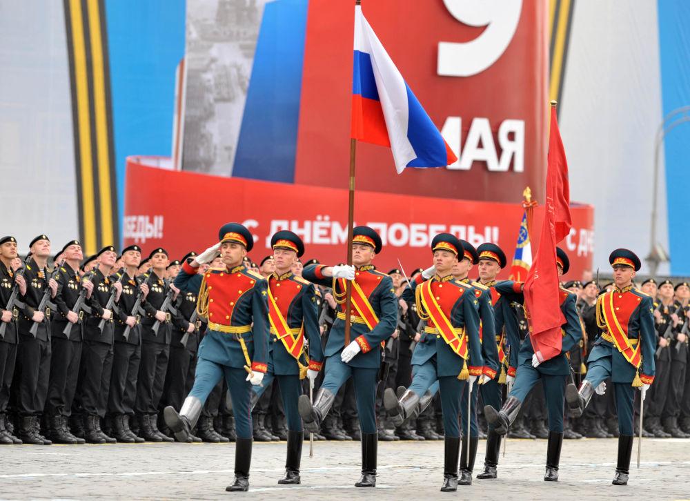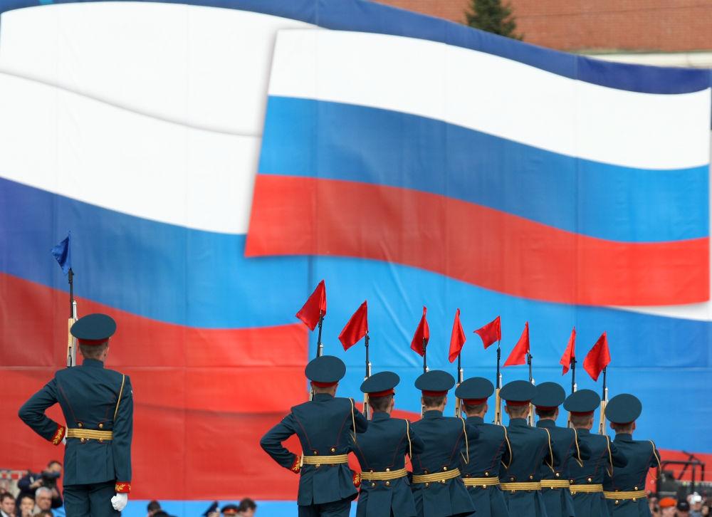 2011年5月9日,在俄罗斯莫斯科举行的纪念卫国战争胜利66周年阅兵式上,士兵护卫俄罗斯国旗从红场走过。新华社记者刘力航摄