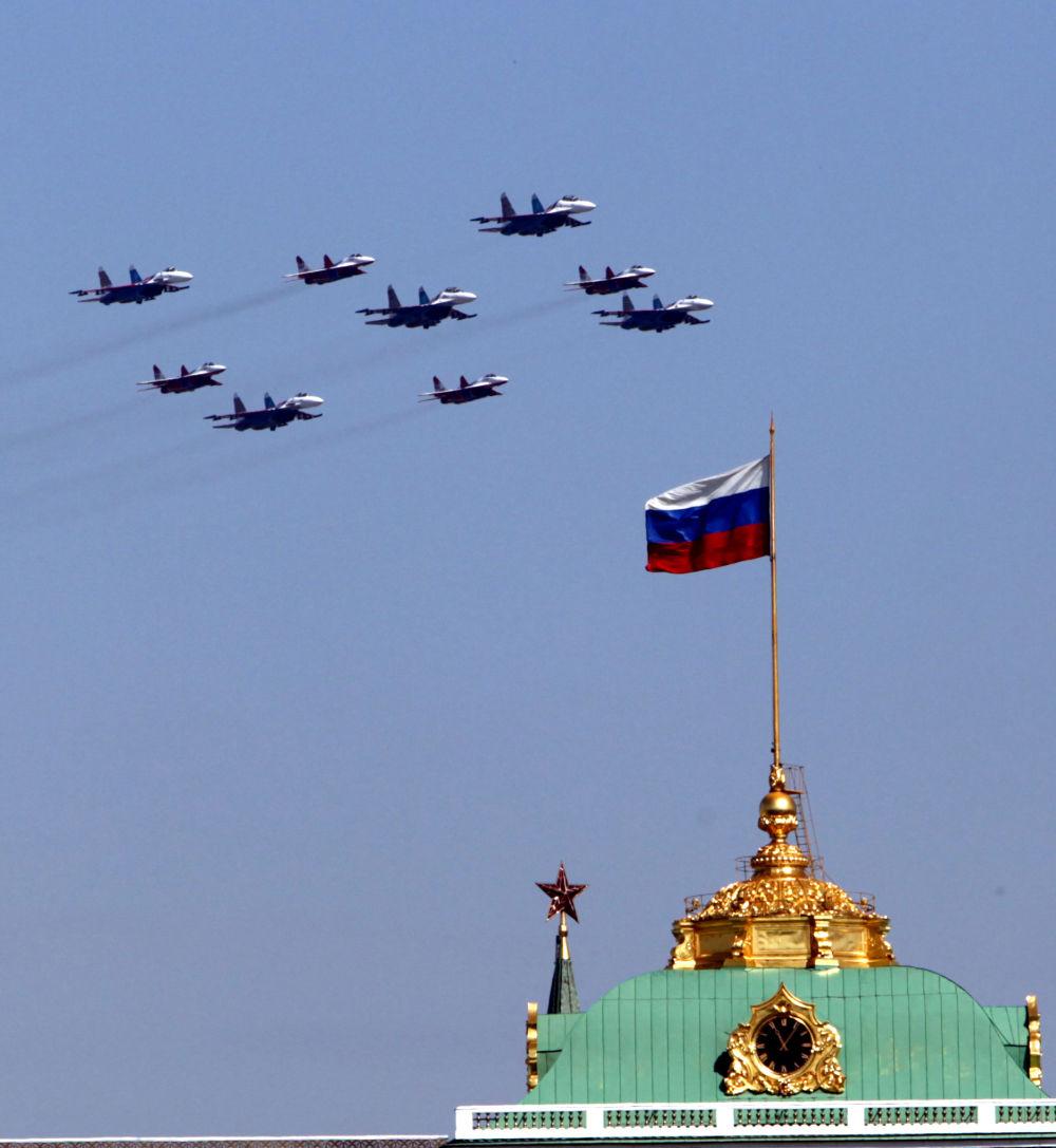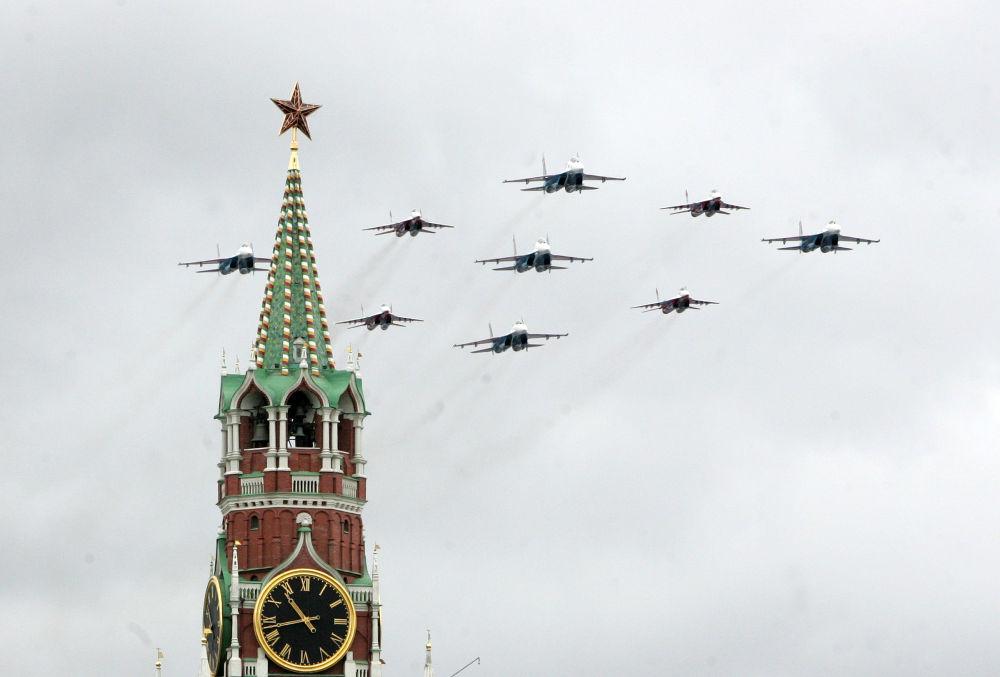 2007年5月9日,在俄罗斯莫斯科举行的纪念卫国战争胜利62周年阅兵式上,战机编队飞过红场上空。新华社记者沈伯韩摄