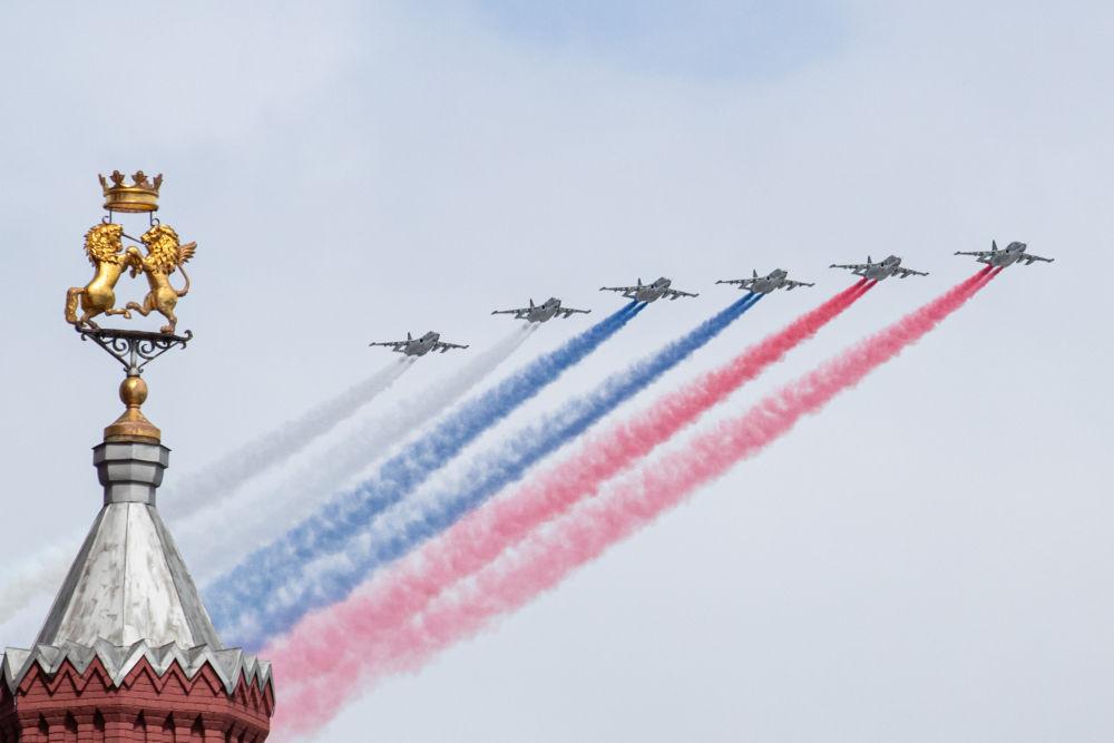 2024年5月9日,在俄罗斯莫斯科举行的纪念卫国战争胜利79周年阅兵式上,苏-25攻击机编队飞过红场上空。新华社记者白雪骐摄