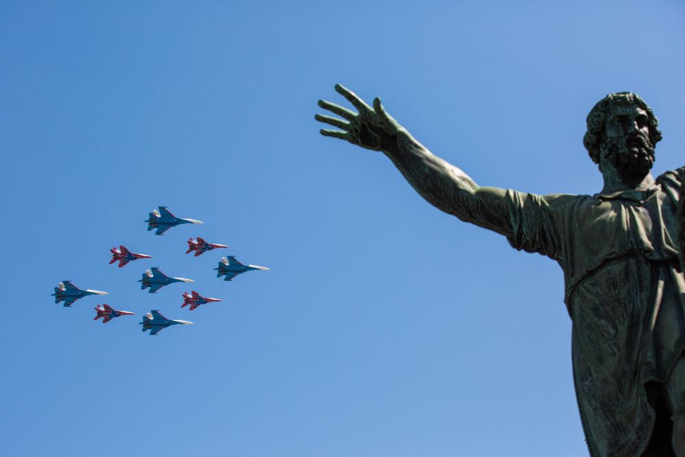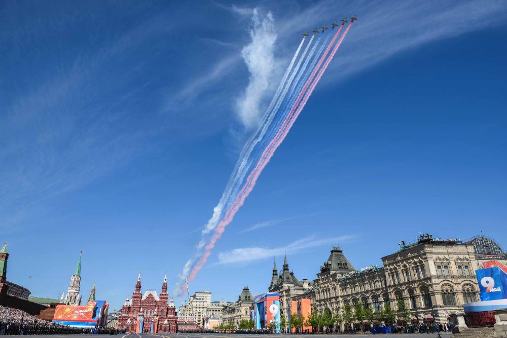 2018年5月9日,在俄罗斯莫斯科举行的纪念卫国战争胜利73周年阅兵式上,战机编队飞过红场上空。新华社发(叶甫盖尼·西尼岑摄)