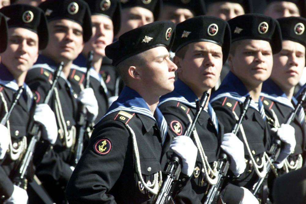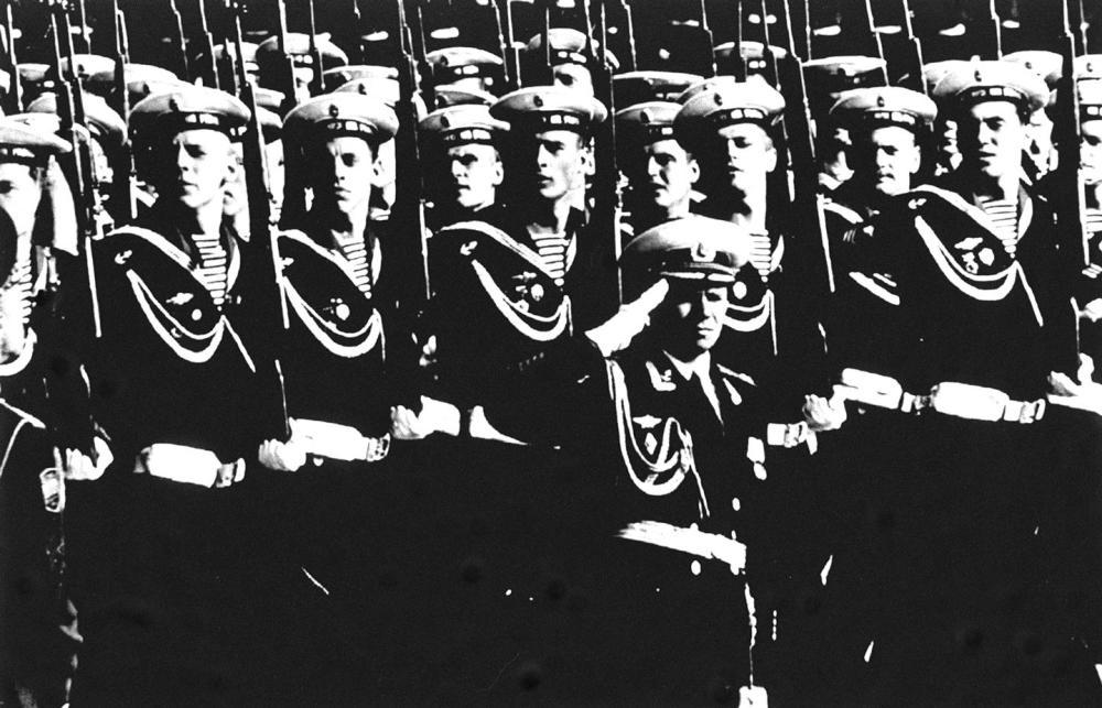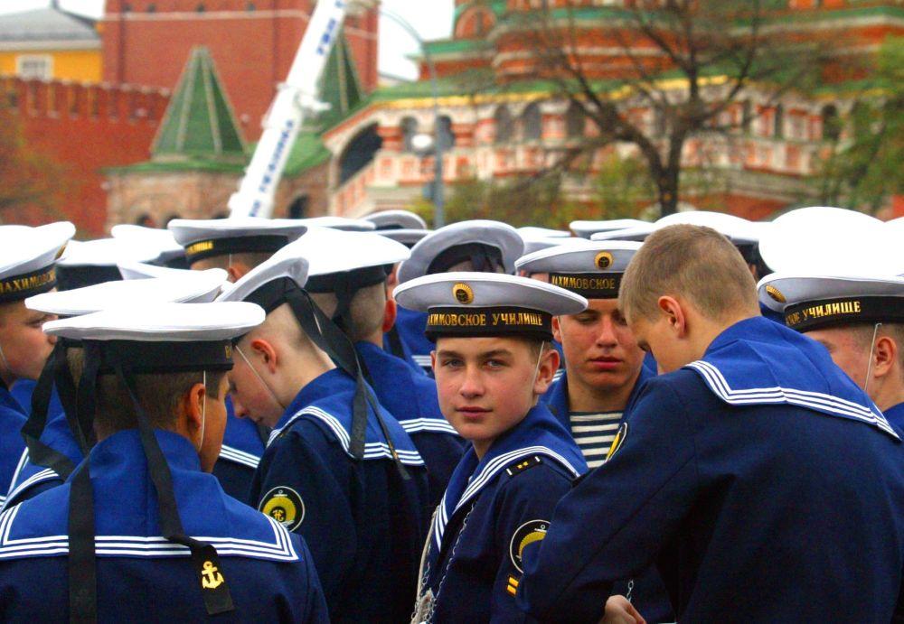1996年5月9日,在俄罗斯莫斯科红场举行的纪念卫国战争胜利51周年阅兵式上,海军学院的学员们接受检阅。新华社记者饶爱民摄