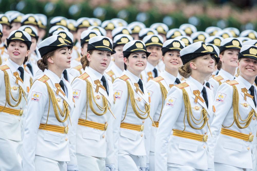 2017年5月9日,在俄罗斯莫斯科举行的纪念卫国战争胜利72周年阅兵式上,女兵列队走过红场。新华社记者吴壮摄