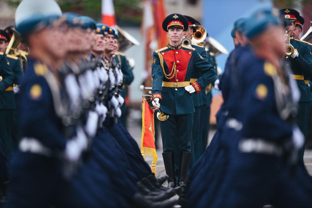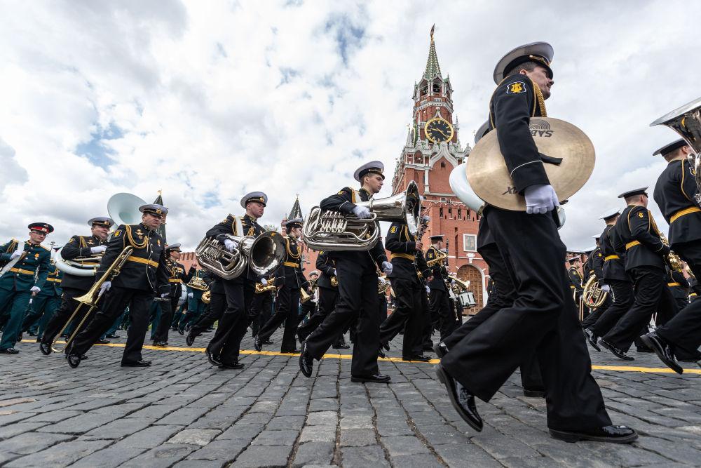 2022年5月9日,在俄罗斯莫斯科,军乐团准备参加纪念卫国战争胜利77周年阅兵式。新华社记者白雪骐摄