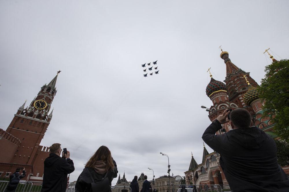 2020年5月9日,在俄罗斯莫斯科红场,人们观看并拍摄纪念卫国战争胜利75周年的空中阅兵。新华社发(亚历山大摄)