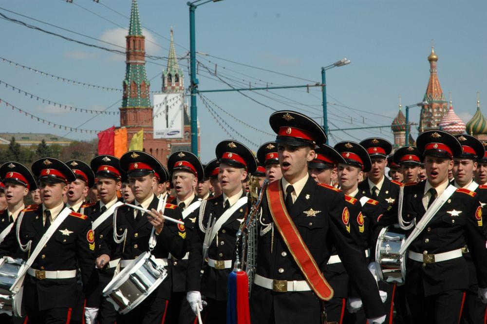 2006年5月9日,在俄罗斯莫斯科举行的纪念卫国战争胜利61周年阅兵式上,一支军乐队接受检阅后离开红场。新华社记者刘轶芳摄