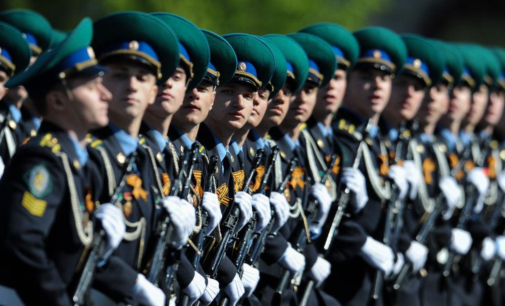 2009年5月9日,士兵在俄罗斯莫斯科举行的纪念卫国战争胜利64周年阅兵式上接受检阅。新华社记者鲁金博摄