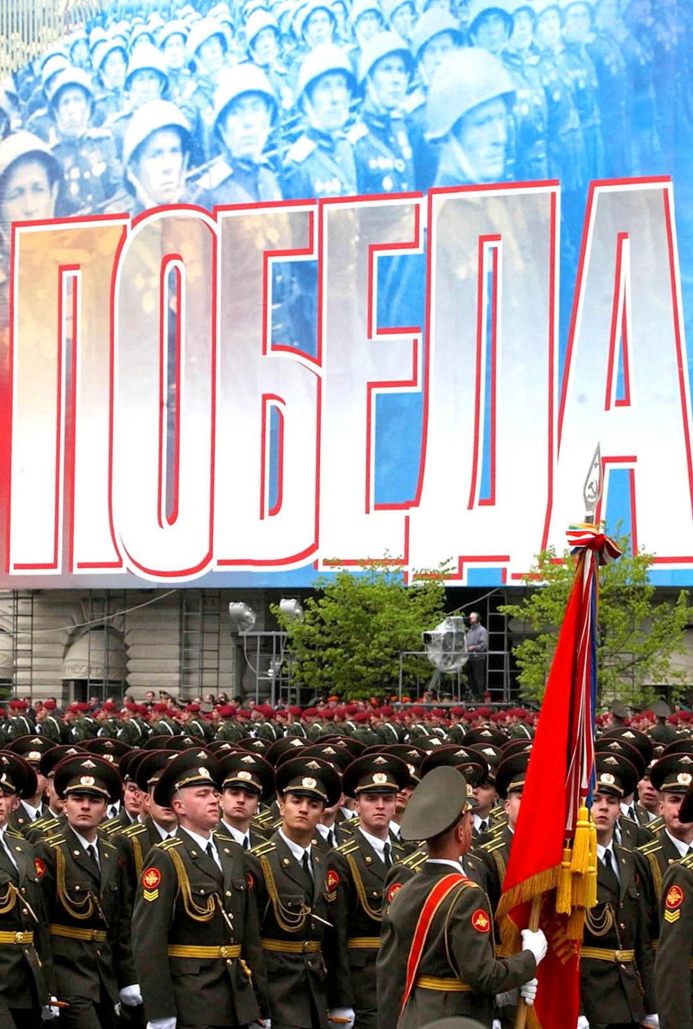 2004年5月9日,在俄罗斯莫斯科举行的纪念卫国战争胜利59周年阅兵式上,士兵走过红场。他们身后名为“胜利”的巨幅照片再现了卫国战争时期红场阅兵的历史瞬间。新华社记者张维革摄