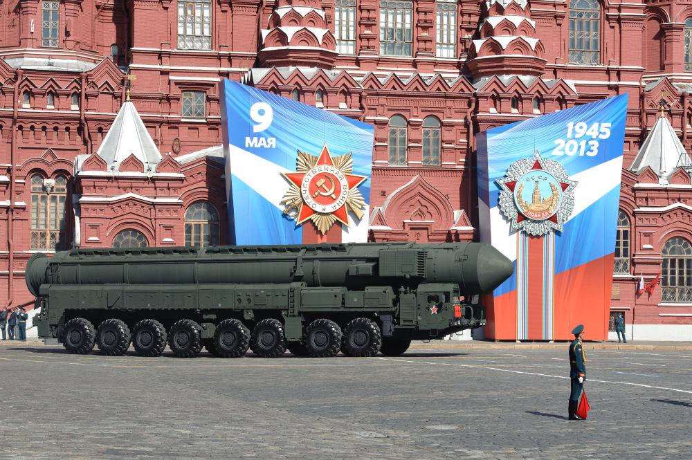2013年5月9日,在俄罗斯莫斯科举行的纪念卫国战争胜利68周年阅兵式上,俄罗斯“白杨-M”洲际弹道导弹亮相。新华社记者姜克红摄