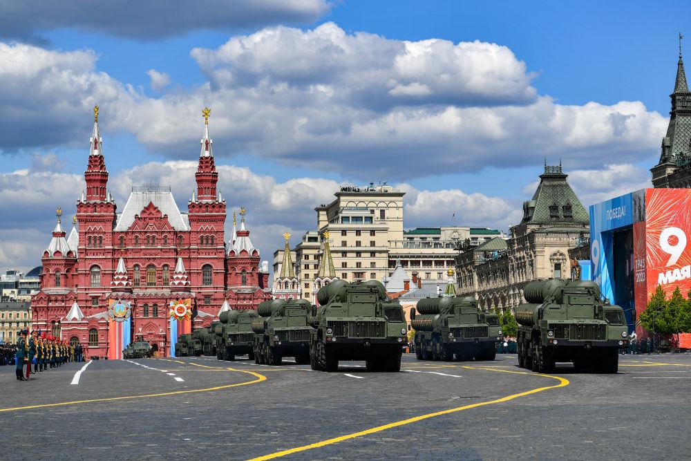 2023年5月9日,在俄罗斯莫斯科举行的纪念卫国战争胜利78周年阅兵式上,S-400防空导弹系统编队驶过红场。新华社记者曹阳摄