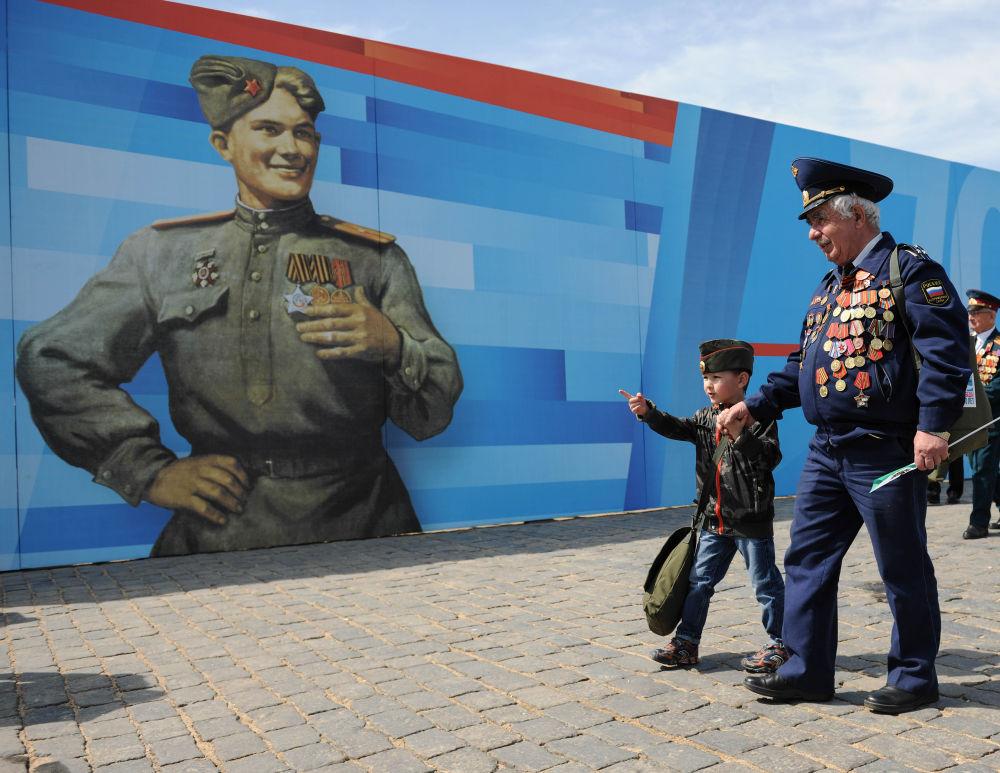 2015年5月9日,在俄罗斯莫斯科,一名老兵与自己的孙子在纪念苏联伟大卫国战争胜利70周年庆典结束后离开红场。新华社记者戴天放摄