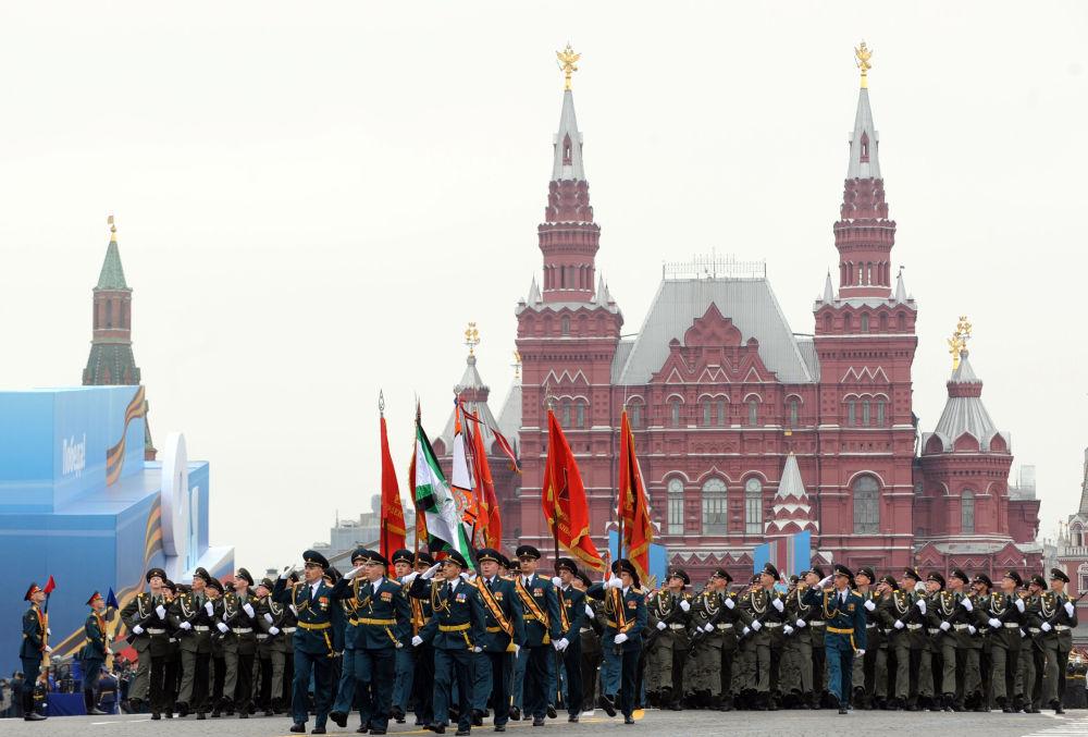 2012年5月9日,在俄罗斯莫斯科举行的纪念卫国战争胜利67周年阅兵式上,军人走过红场。新华社记者李勇摄