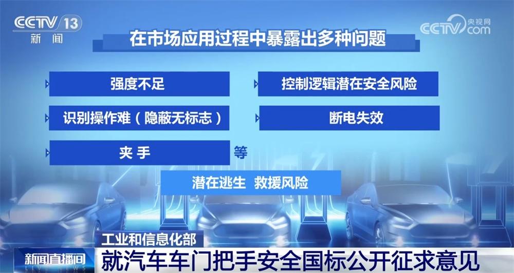 记者9日从工业和信息化部获悉,针对隐藏式车门把手在实际应用过程中暴露出来的一些问题,工业和信息化部公开征集对《汽车车门把手安全技术要求》强制性国家标准制修订计划项目的意见。
