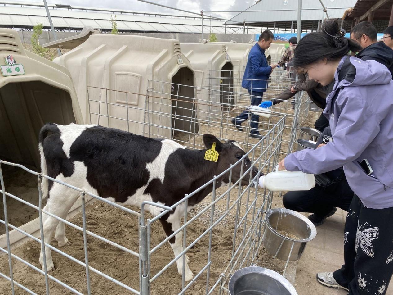 图为天瑞祥牧场研学基地,游客在体验给小牛喂奶。冶明伟 摄