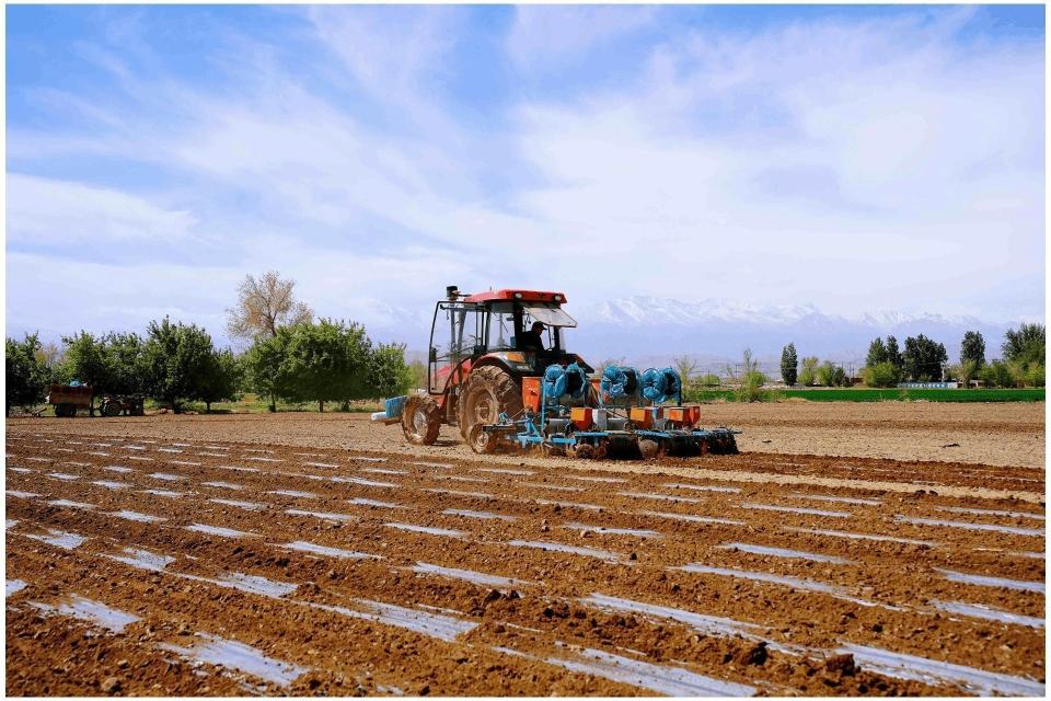 在吉木萨尔县三台镇羊圈台子村的高粱地里,装有北斗导航的大型播种机在田间来回穿梭作业,高粱种子被精准地播撒进土壤里,铺设地膜、滴灌带、播种、覆土、平整等工序一气呵成,与传统人工播种相比,机械化播种不仅速度快,还能保证播种深度和间距均匀一致,为高粱出苗整齐、生长健壮提供良好条件。