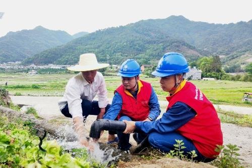 国家电网陕西省平利县供电公司党员服务队在陕西平利县秋河村帮助农户调试抽水水泵。(陈思源 摄)