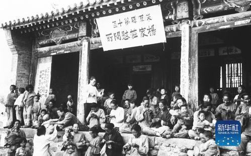 河北涞源杨家庄妇女做军鞋。沙飞 摄