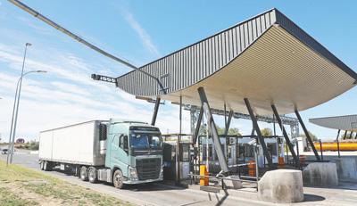 货车通过智利5号公路塔尔卡—奇廉段位于塔尔卡市的一处收费站。人民日报拉美中心分社 路易斯·布兰科 摄