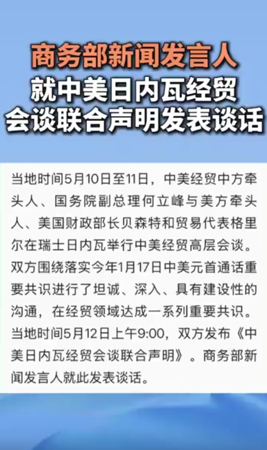5月12日,中美在日内瓦就经贸问题发布联合声明,决定大幅降低双边关税水平,美方取消了共计91%的加征关税,中方相应取消了91%的反制关税;美方暂停实施24%的“对等关税”,中方也相应暂停实施24%的反制关税,并重启机制性磋商。在当前全球经济复苏乏力、地缘风险上升的背景下,这一重要进展释放出中美双方致力于稳住经贸关系的积极信号,体现出两国有能力也有意愿管控分歧、寻求共识。