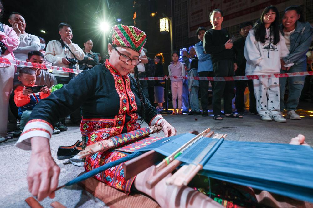 2025年3月30日,2025海南黎族苗族传统节日“三月三”主会场活动在海南五指山市举行。这是非遗传承人在活动现场表演织黎锦。新华社记者 张丽芸 摄
