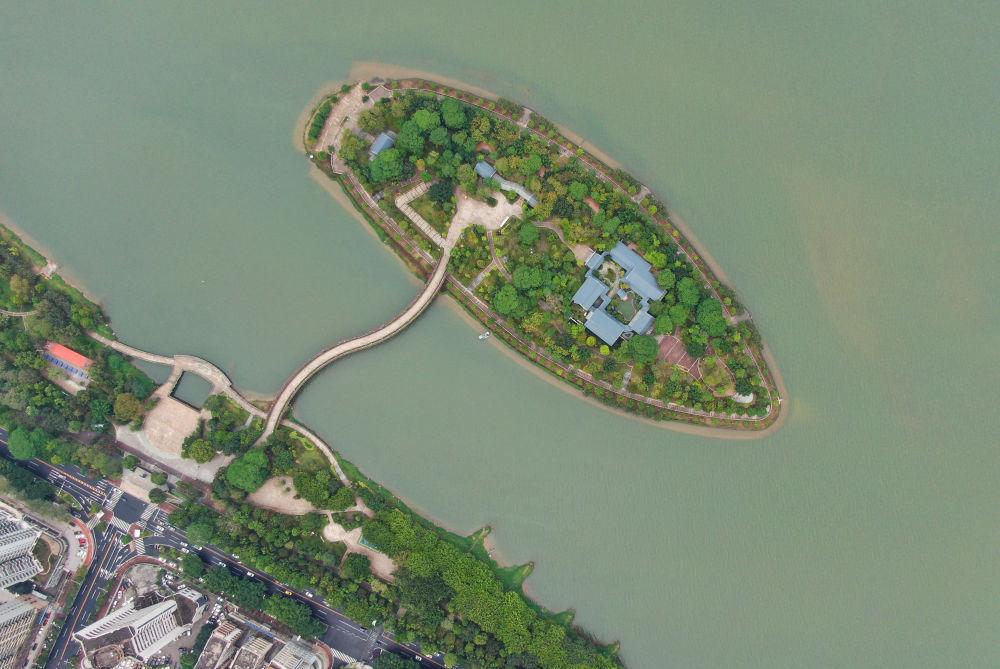 2021年4月8日拍摄的江心岛书院所在的广东清远清城区北江的江心岛(无人机照片)。新华社记者 邓华 摄