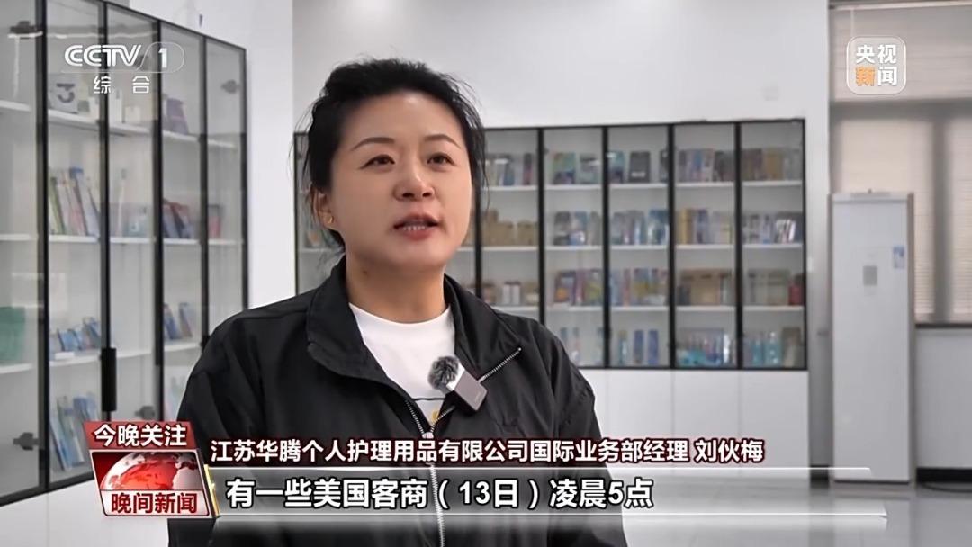 江苏华腾个人护理用品有限公司国际业务部经理 刘伙梅:有一些美国客商13日凌晨5点直接发来新订单的设计,我们在收到设计以后,第一时间安排打样生产,首批订单预计在5月20日左右就可以发货。
