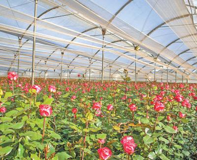 绿叶农场玫瑰种植园的大棚内,玫瑰竞相绽放。
