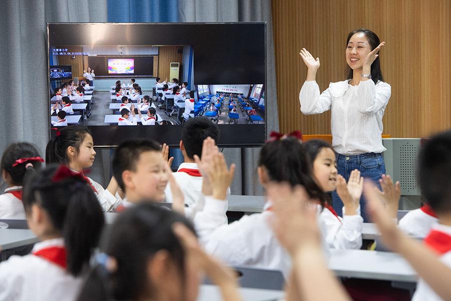 图为在湖南省祁阳市文明铺镇中心小学,师生通过远程课程学习。