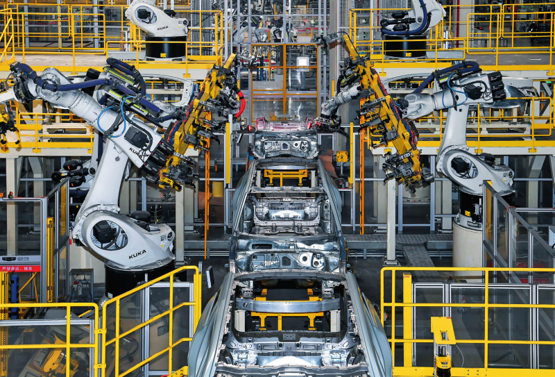在吉利汽车陕西宝鸡制 造基地焊装厂拍摄的自动化 焊接线(2025年2月26日摄) 邹竞一摄 / 本刊