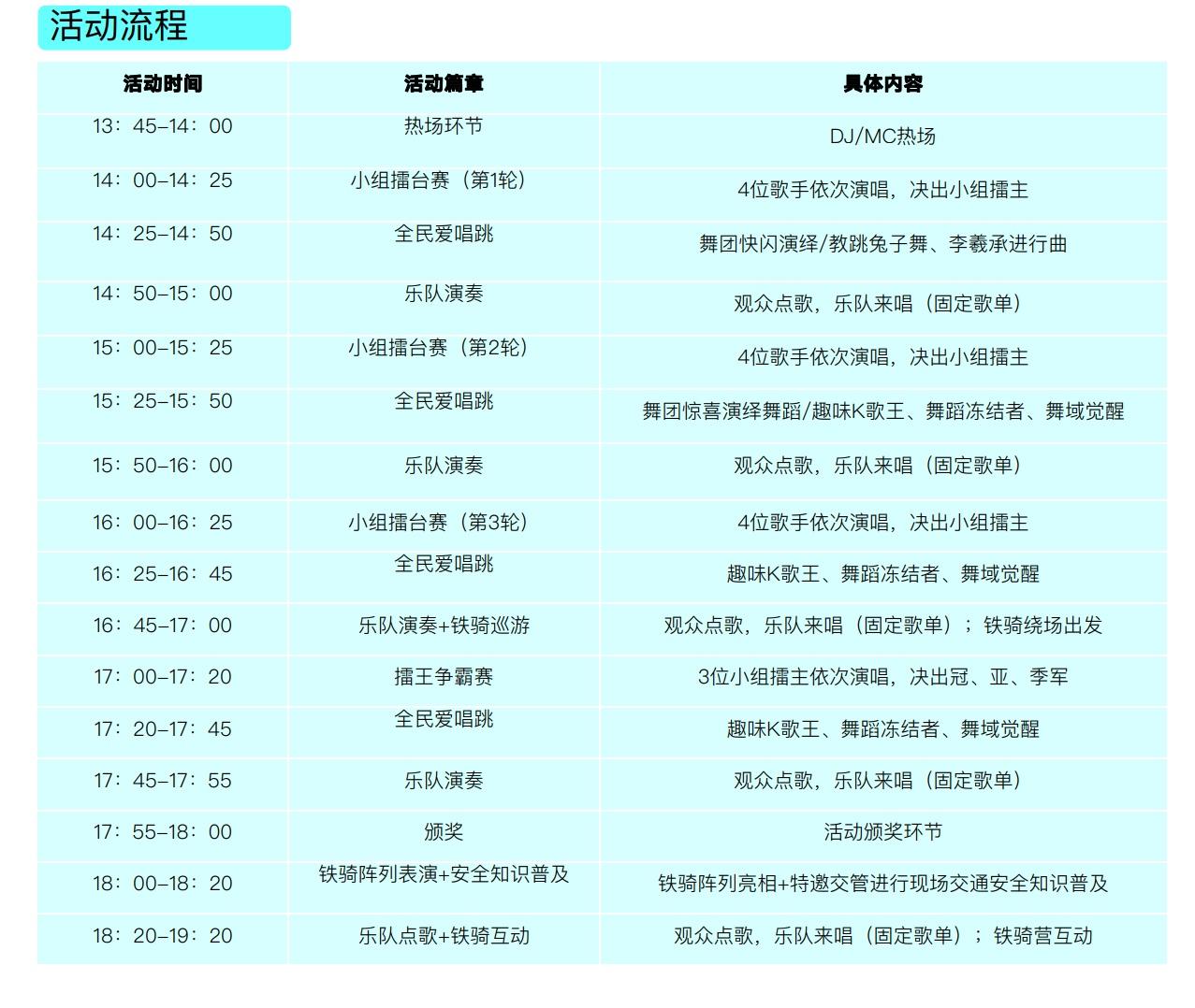 白天设 K 歌擂台、全民共舞、铁骑互动,夜晚开启篝火晚会并融合凤凰传奇等民族歌舞与年代经典曲目,同步呈现贵州非遗技艺与特色美食市集。