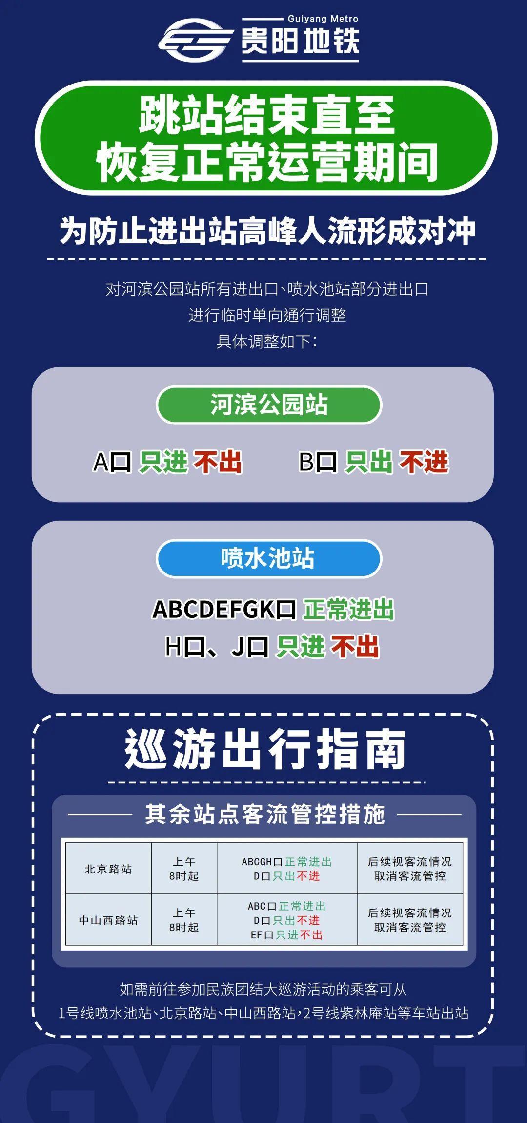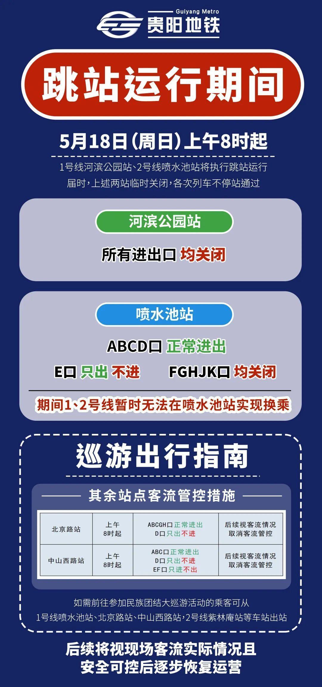 因5月18日上午举行2025贵州民族团结大巡游活动,为做好巡游活动期间的大客流应对,保障市民游客出行安全,根据安保工作要求,5月18日(周日)上午8时起,1号线河滨公园站、2号线喷水池站将执行跳站运行(注:1号线各次列车经过河滨公园站时将执行不停站通过,2号线各次列车经过喷水池站时将执行不停站通过)。1号线喷水池站不受影响,各次列车经过正常停站,跳站期间喷水池站不能实现1、2号线换乘。
