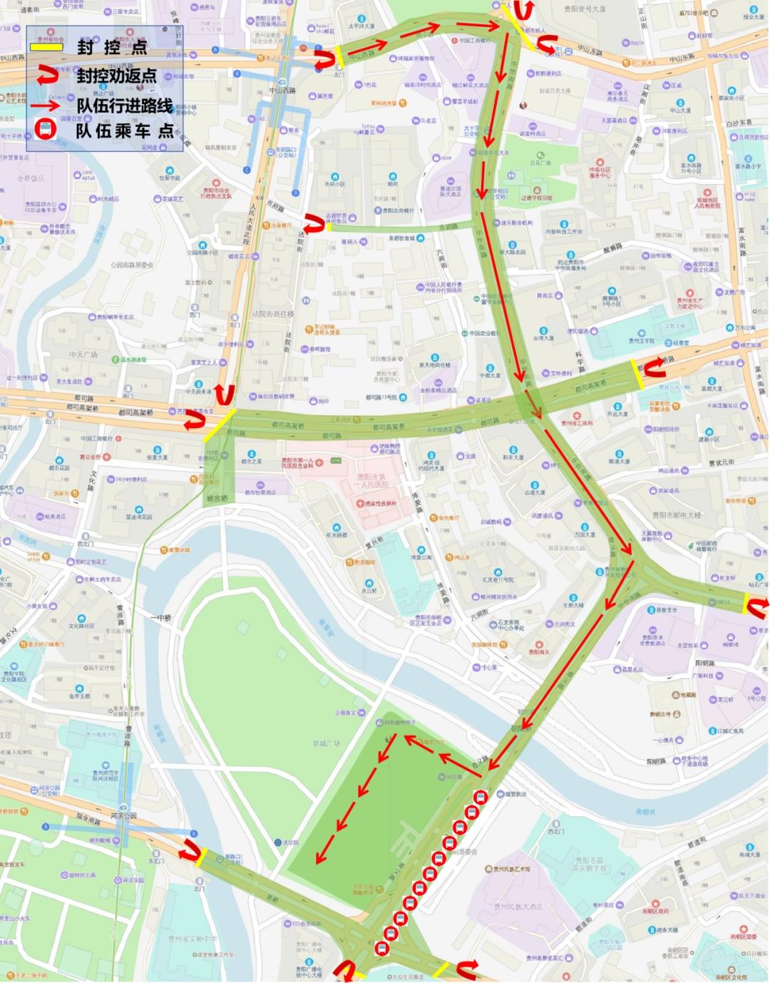 巡游路线:黔灵西路与中华北路交界点→中华北路→中华中路→中华南路→遵义路→筑城广场