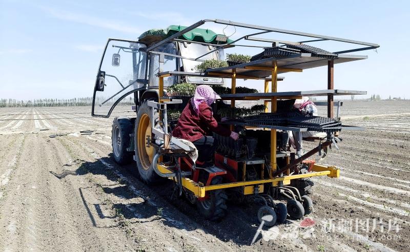 4月29日,沙湾市乌兰乌苏镇头浮新村500余亩订单番茄地里,番茄秧苗移栽机正在作业。沙湾市融媒体中心供图