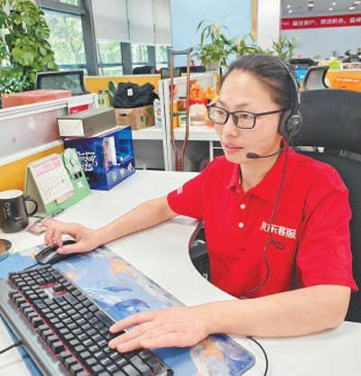 5月15日下午4点半,江苏宿迁,许春香正面带微笑与客户沟通,她头戴耳麦,眼睛紧盯屏幕,手指在键盘上灵活跳动。