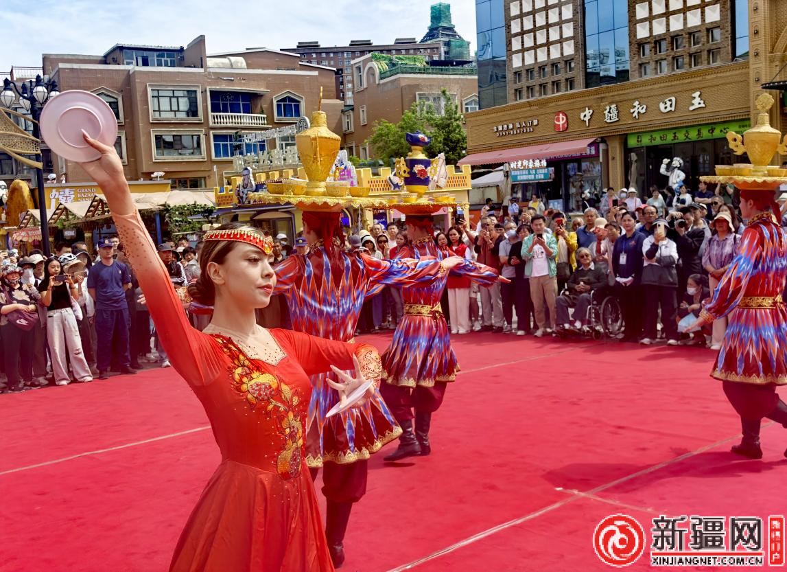 当日,在新疆国际大巴扎入口处,热情欢快的新疆歌舞喜迎八方来客。(薛玲摄)
