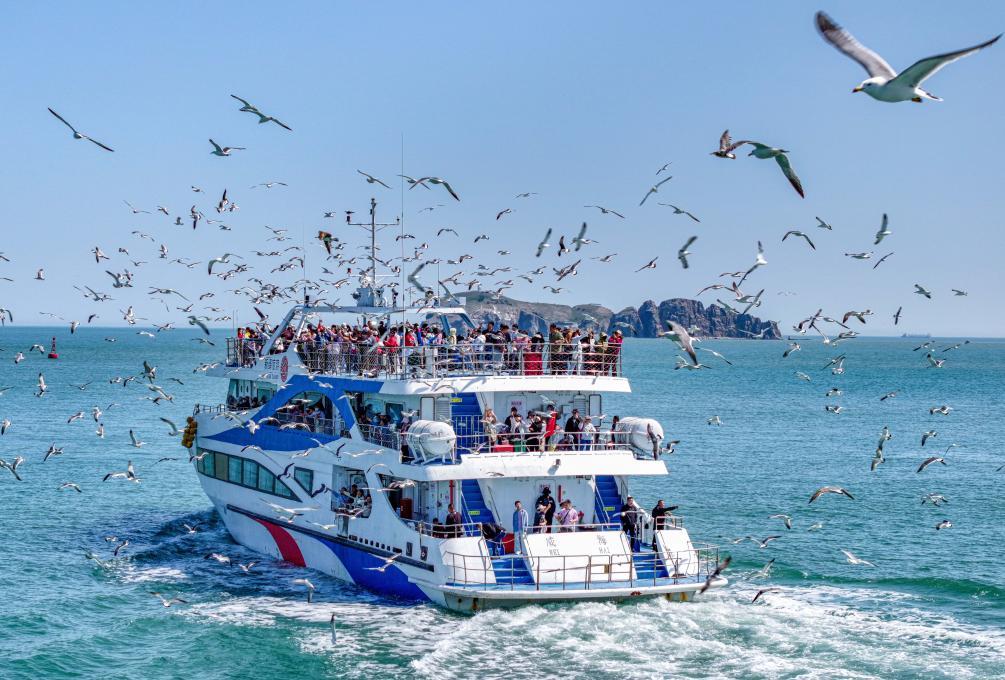 5月4日,在山东省荣成市海驴岛海域,游客乘坐海驴岛环岛游专线与黑尾鸥互动(无人机照片)。新华社发(李信君 摄)