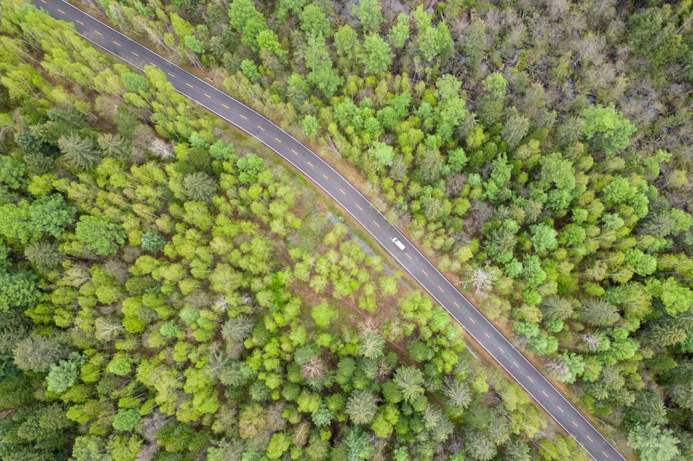 2024年7月11日,游客乘坐电瓶车在伊春市上甘岭溪水国家森林公园内穿行(无人机照片)。新华社记者 张涛 摄