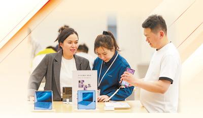 浙江金华一大型商业购物中心里,顾客在挑选新款手机。胡肖飞摄