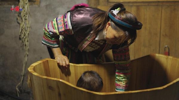 赵有辉:我们瑶家药浴,第一个(用处)还是女人的妇产。有孩子快落地了,奶奶(婆婆)和公公就到大山里面去采药,拿到家里挂在楼上晒干。(儿)媳妇痛肚了,公公就马上烧火,马上倒水在大桶里面,(产后)就喊孩子的妈妈(到桶里面)泡,又舀水给刚落地的孩子泡,在盆里面泡,这样孩子可以预防疾病。孩子的妈妈泡了(瑶浴),她的身体干净得很快,三天可以在家搞小生产、劳动。