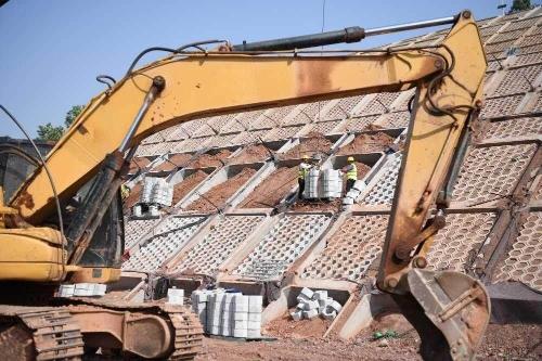 4月25日,中铁十一局工人在合武高铁安徽段金叶隧道口进行边坡施工。新华社记者 刘军喜 摄