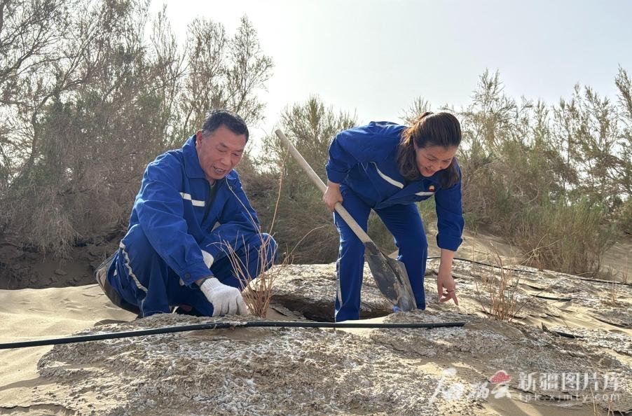 5月16日,黄茂桃与丈夫李伟正在查看新栽种的梭梭。石榴云/新疆日报记者 拍热扎提·阿不都 摄