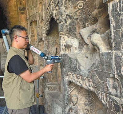风从河面吹来,闷热的洞窟里有了丝丝凉意。古阳洞内,脚手架上,马朝龙和同事正在进行石窟测绘、病害监测。