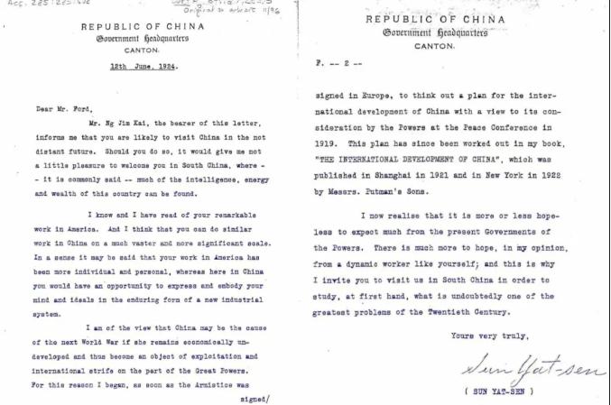 1924年,孙中山先生致信亨利·福特(Henry Ford),邀请其前往中国南方实地考察,希望借助福特在工业化方面的经验与实力,推动中国现代工业的发展,并提出“以更盛大的规模成就同样的事业”的设想。