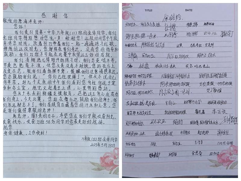 天山南麓传佳音,粤疆两地情谊深。近日,星海音乐学院音乐教育学院(下称“音乐教育学院”)收到一封来自新疆生产建设兵团第三师五十一团第一中学八年级11班的感谢信,信中真挚的话语,道出了对00后支教老师唐海洋的深厚情谊。