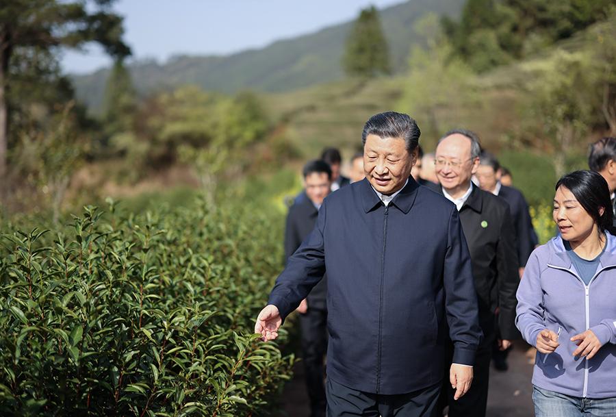 在陕西,习近平总书记深入茶园察看春茶长势,同茶农们亲切交谈,鼓励大家坚定不移走生态优先、绿色发展之路,因茶致富、因茶兴业;