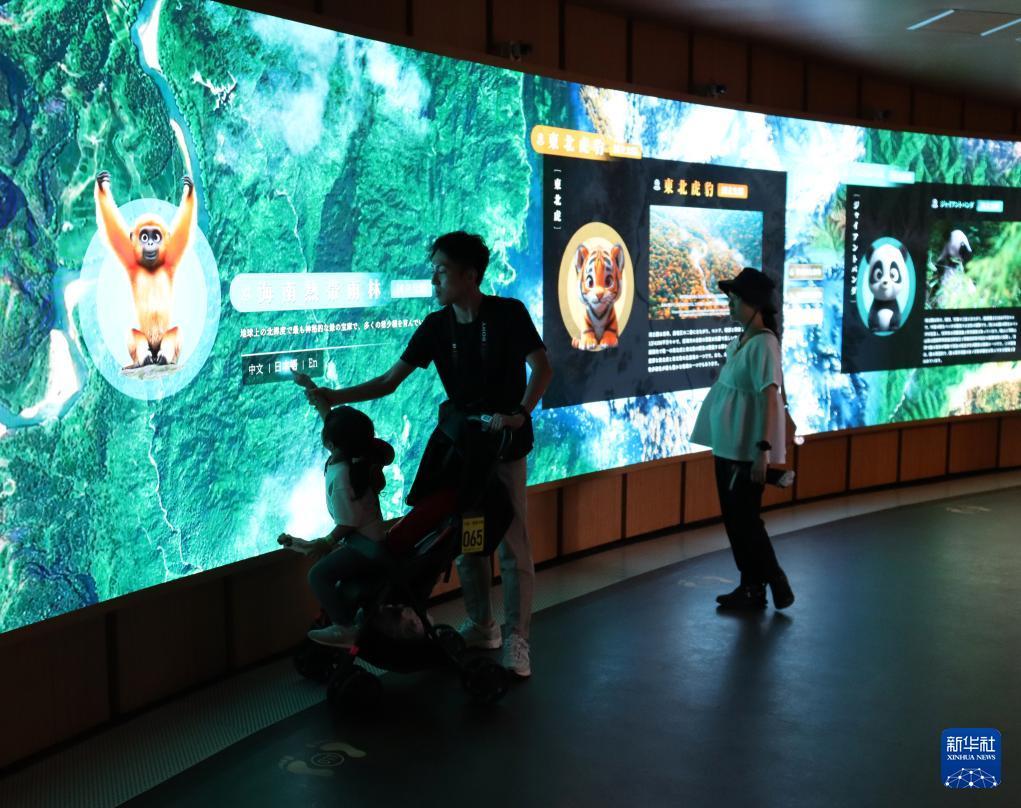 “花瓣”旁的弧形交互屏上介绍着三江源、武夷山、海南热带雨林等中国国家公园在野生动植物保护方面取得的积极成效。朱鹮、林麝等国家重点保护野生动物的体态特征、生存技能、分布情况等文字说明,公园面积、品种数量等直观数据吸引各国游客久久伫立。竹下说,中国的野生动植物种类繁多、超乎想象,中国馆的精彩展示让他大开眼界。