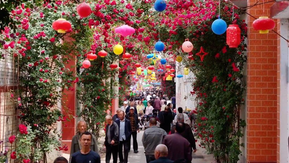 五月芳菲醉人间,3000余株藤蔓月季在沟渠头村的巷道间翻涌成花海。